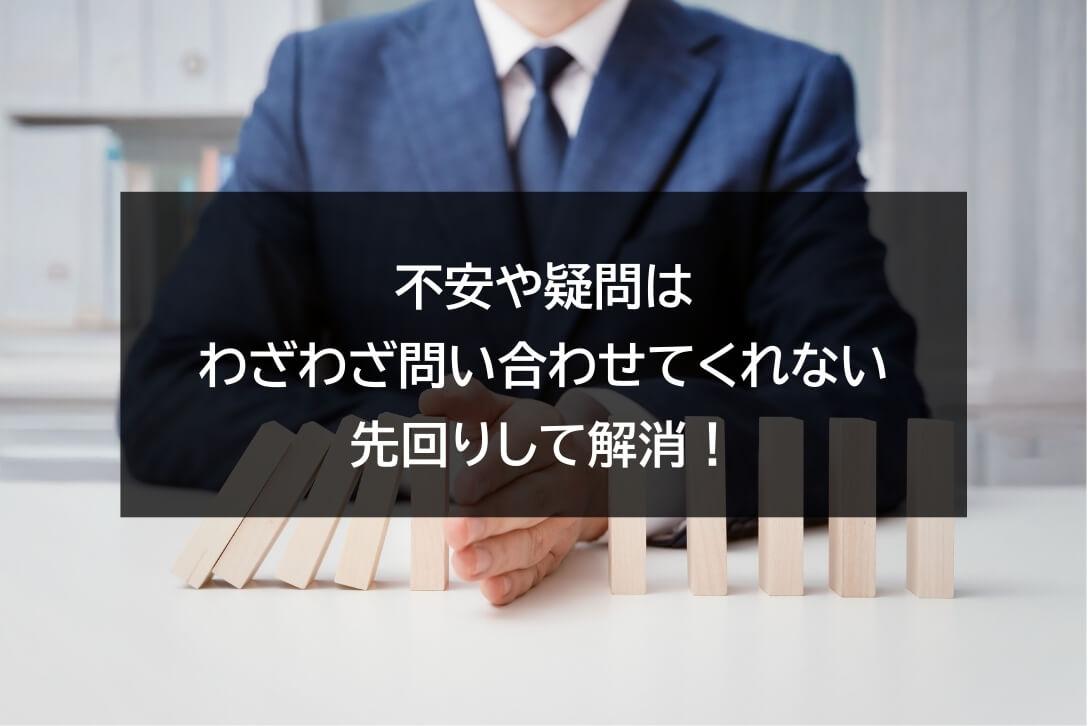 売り手は「気軽にお問い合わせください!」と言いますが、わざわざ問い合わせてくれるお客様は本当に稀で、ほとんどの場合は勝手に不安や疑問に思って、勝手にいなくなります。僕たち売り手は先回りしてその対策をする必要があるわけです。