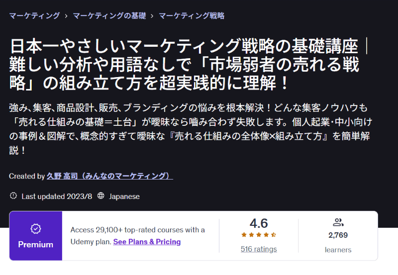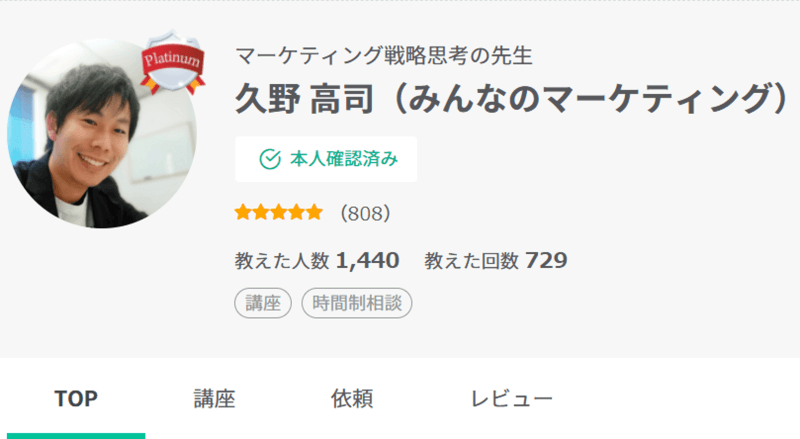 プラチナランク講師。2018年に登録し25年11月現在、1400名以上が受講し、800件以上のレビューを獲得。平均評価は5点満点中「4.91点」でトップレベルの満足度を獲得・維持しています。(複数の講座を開講し、マーケティング講座のレビューは400件以上/平均評価は4.91点)